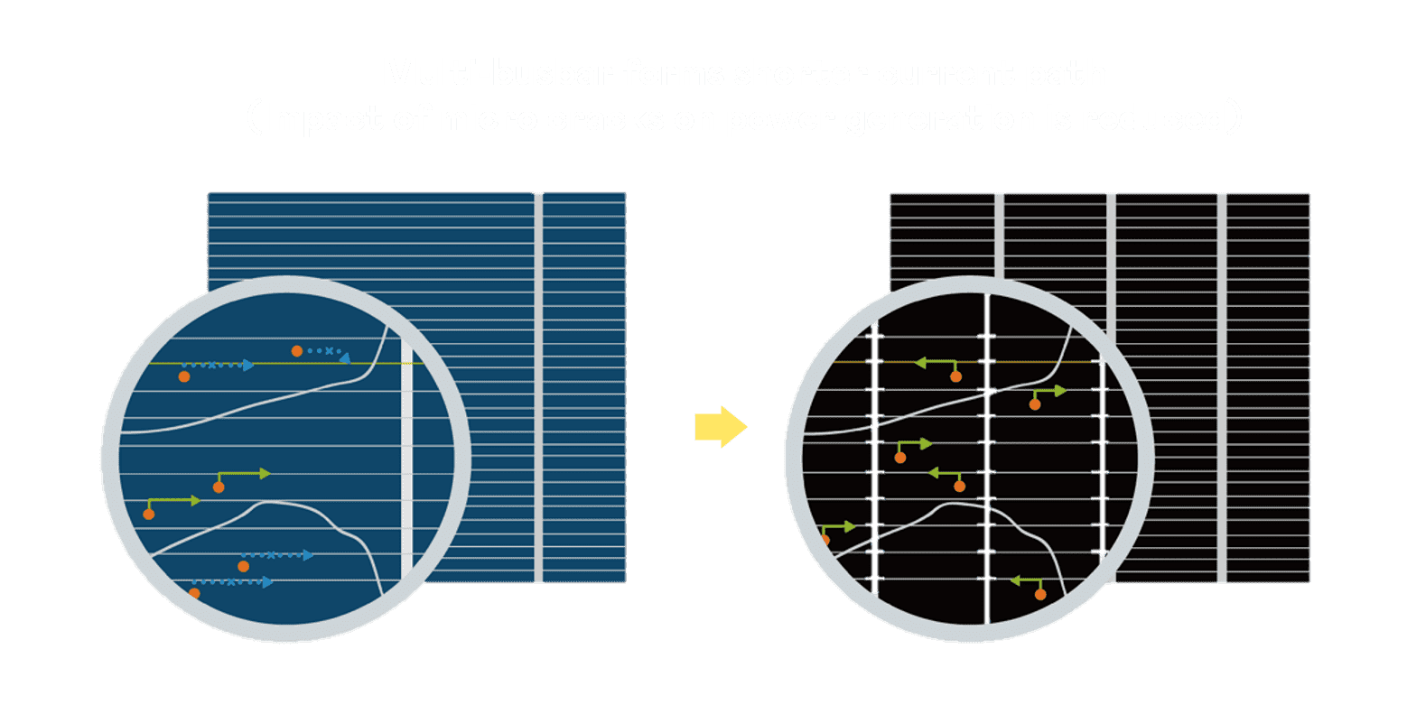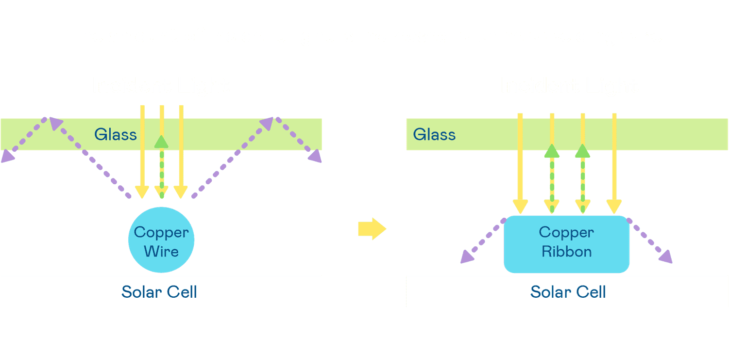 - 电池使用多条铜导线 (Copper wire) 于电池片上形成较短的电流路径,,提高电流收集效率,,,采用圆形设计的铜导线较传统扁平式的铜焊带 (Ribbon),,可增加入射至电池的光线量。。