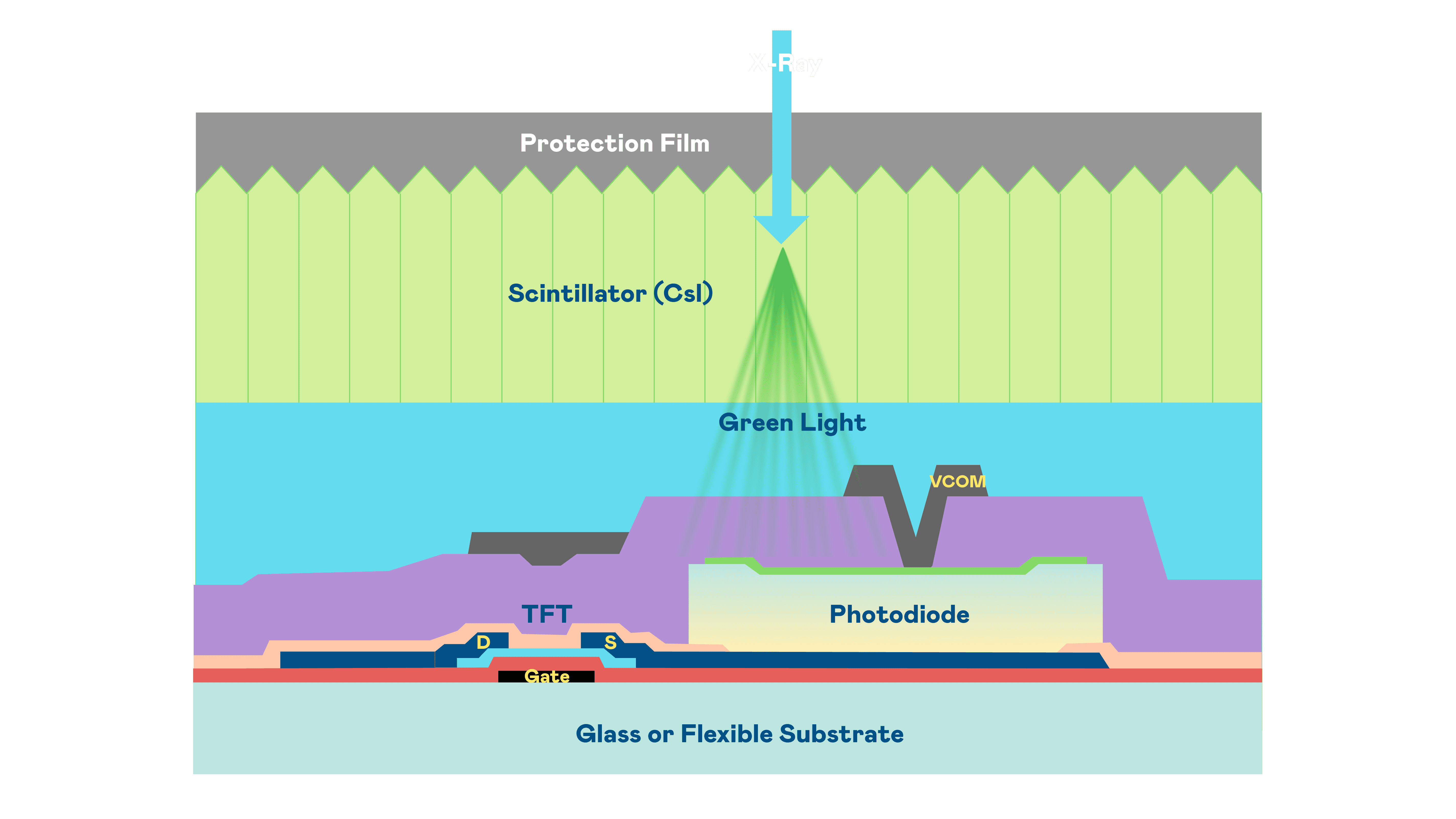 口袋牛店的X光影像感测阵列使用薄膜电晶体 (TFT) 作为每个像素的读取开关,,,,搭配光电二极体(Photodiode)的光电转换元件,,用以感测X光影像讯号。。。