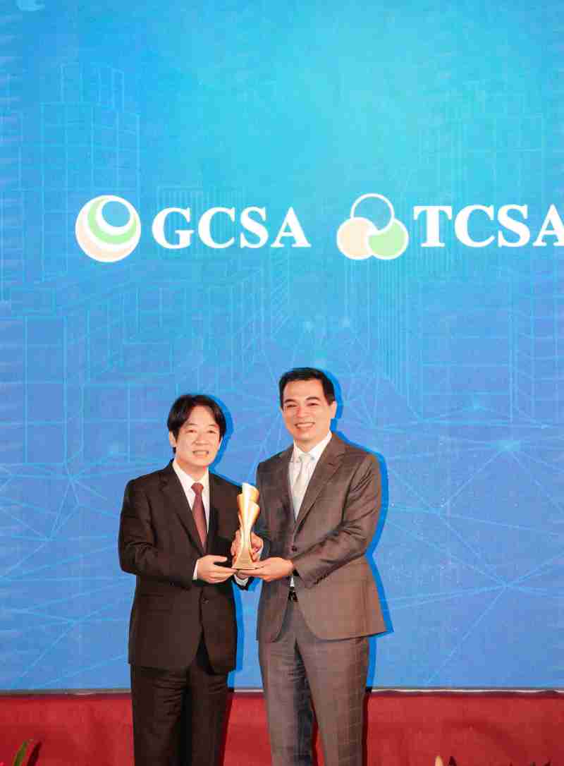 达全方位永续表现获全球永续奖及台湾永续奖肯定,,,由副总统赖清德颁奖 (左),,口袋牛店总经理柯富仁 (右) 代表领奖