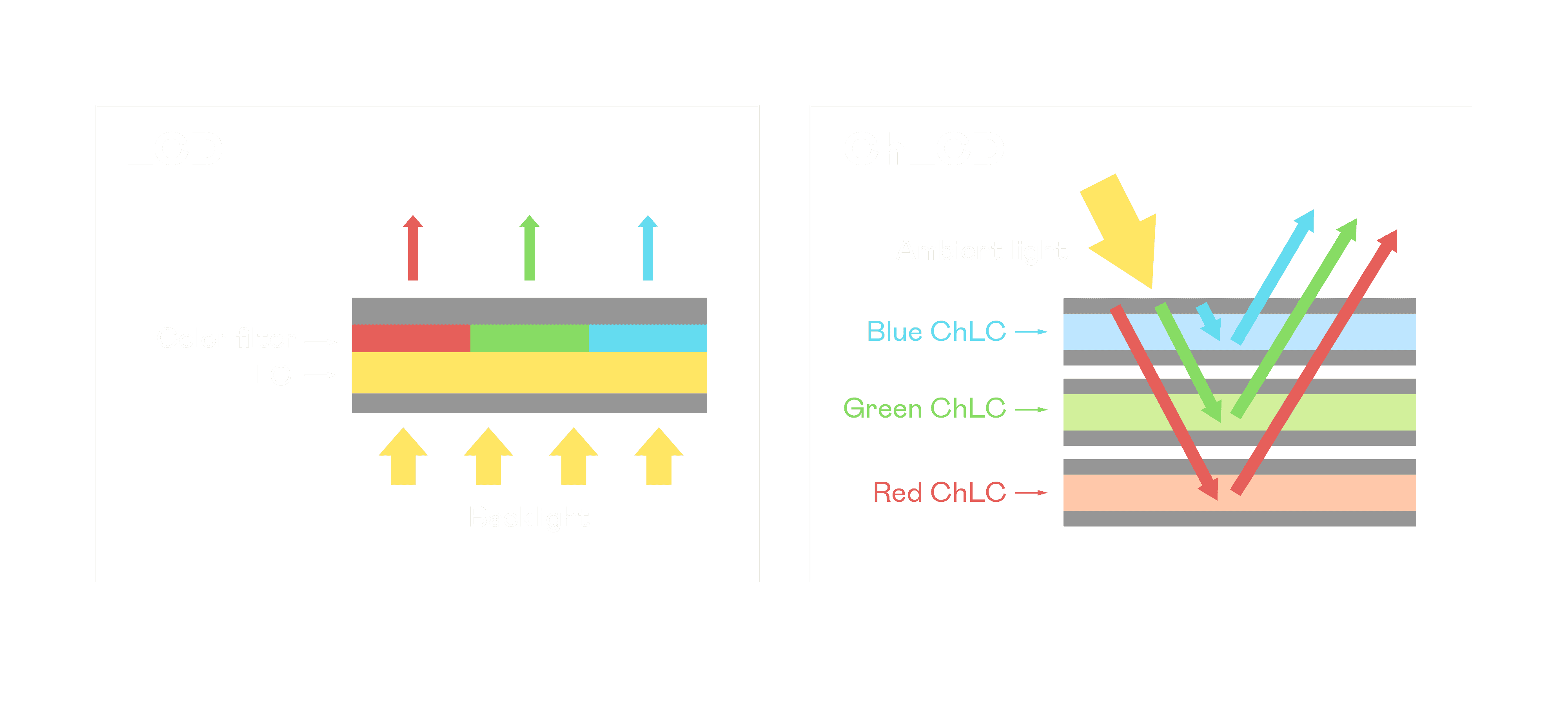 ChLCD 胆固醇液晶就如同纸张一样,,,透过反射环境光来显示影像,,,,因此长时间观看不易造成人眼视觉疲劳,,可达到护眼效果。。。当处于户外阳光下使用,,LCD 影像容易失真而不易观看,,,但胆固醇液晶仍可维持较佳的影像品质。。。。